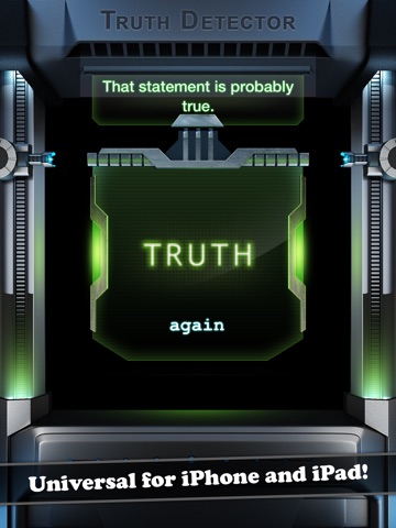 Cette application nest pas très intelligente,car si on dit un mensonge il répond que c vrai,il jongle entre vrai et faux...même quand je ne parle pas il dit vrai ou faux!!! Mais si on lit la description,il dise que c juste pour samuser et que ce nest pas vrai...il faut donc ne pas être un flemmard et lire la fin de la description !!!!