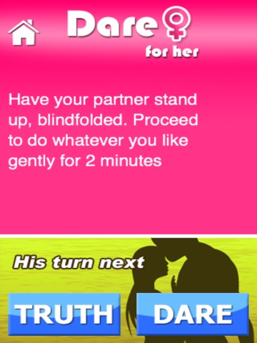 If you want to have a really fun time with your boyfriend or girlfriend, get this app and buy the full version! The free version doesnt cut it! There are so many HOT dares you can do that arent outrageous that you actually want to do. If youre at home, theyre completely doable and really sexy and fun. Throw some alcohol in there too, and youve got a really great night ahead. ;) I mean boos, quality time with your significant other, and getting laid... I there anything better to do on a Friday? :P