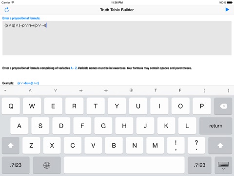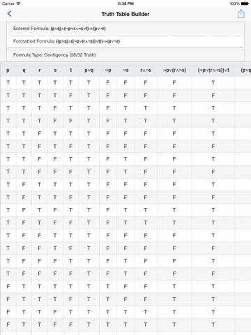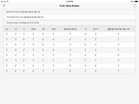 Truth Table Builder is an easy, quick and reliable app that builds truth tables from Boolean/propositional formulas that you enter.