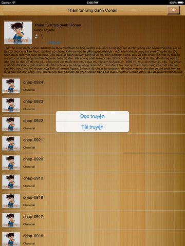 App đọc truyên tranh thám tử lừng danh Conan, bạn có thể download truyện tranh về để đọc offline,hoặc đọc trực tiếp online.App gồm full 924 tập truyện thám tử lừng danh Conan nổi tiếng. Giao diện đơn giản, thân thiện dễ sử dung. Các bạn có thể gửi yêu ý kiến trong app hoặc quan fanpage :