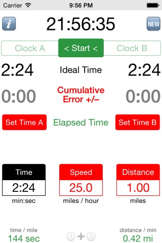 This app allows you to compute the ideal time to cover a particular distance at a particular speed, to add that time to one of two clocks A or B, and then to toggle between the clocks for each leg of the rally while recording the cumulative error as you go.