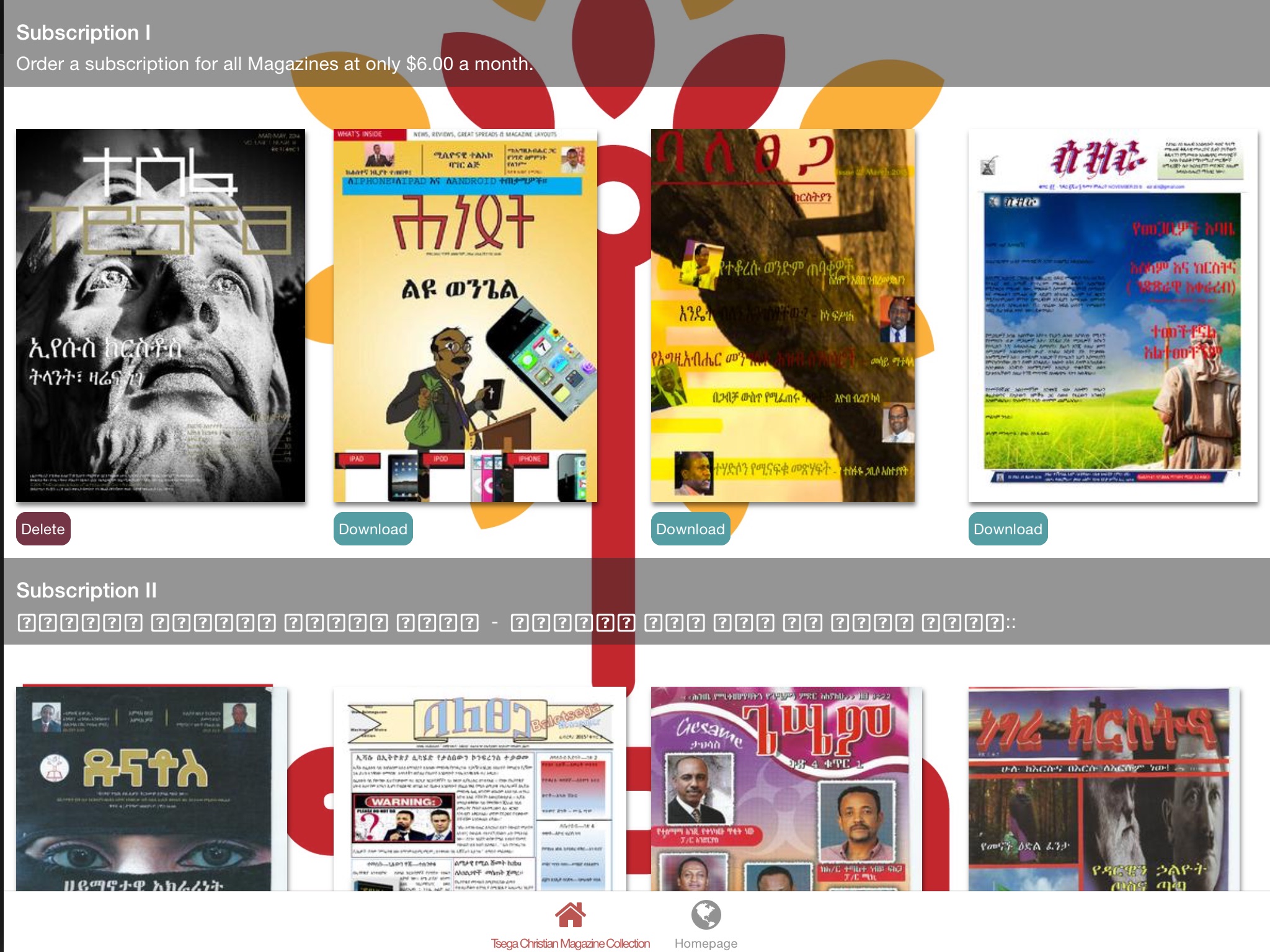 Subscribers will have access to The following Ten Magazines: Hintset, Baletsega-Christian, Fiker, Adamna Hewan, Tesfa, Selihom, Dunatos, Brehan, Negerekristyan and Giesem. In addition subscribers will receive several complimentary publications from our Partner publishers.