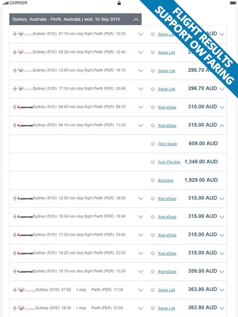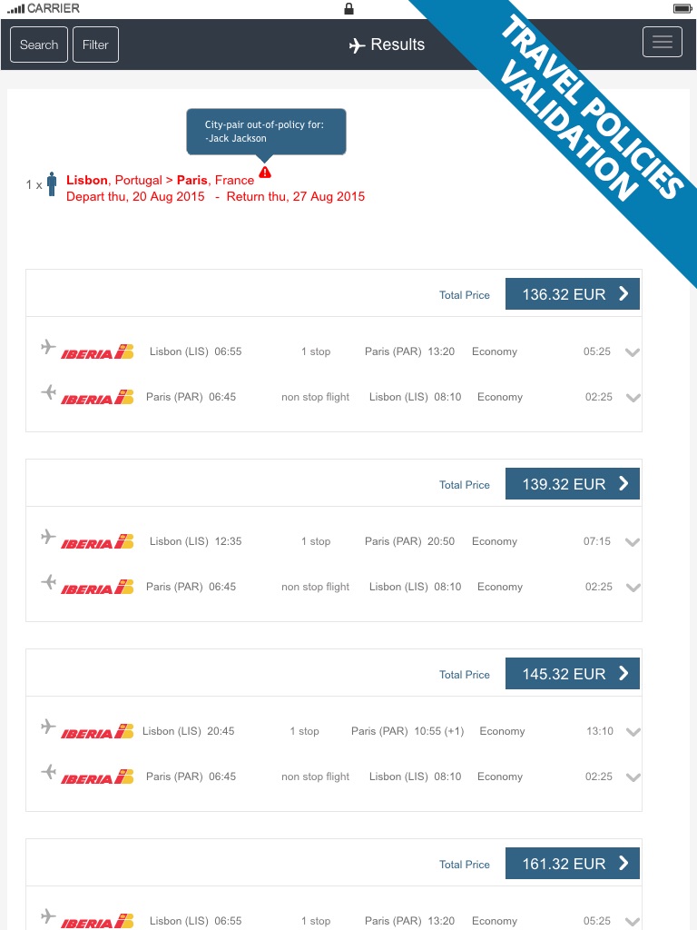 Search results are validated according with each traveller travel policy and out-of-policy results are highlighted on screen to alert the user. Travellers out-of-policy products if added to the trip are marked accordingly during all the booking process.