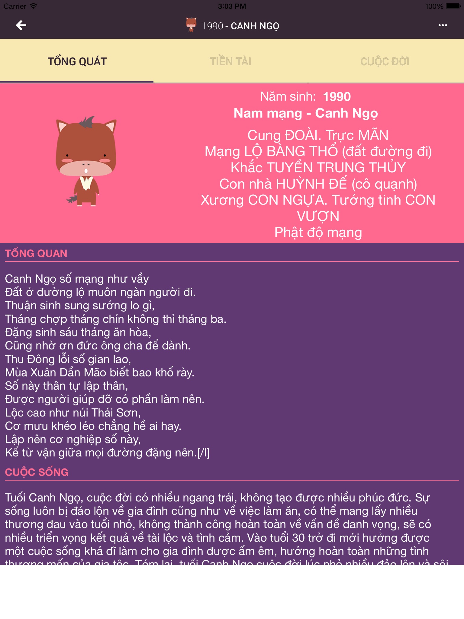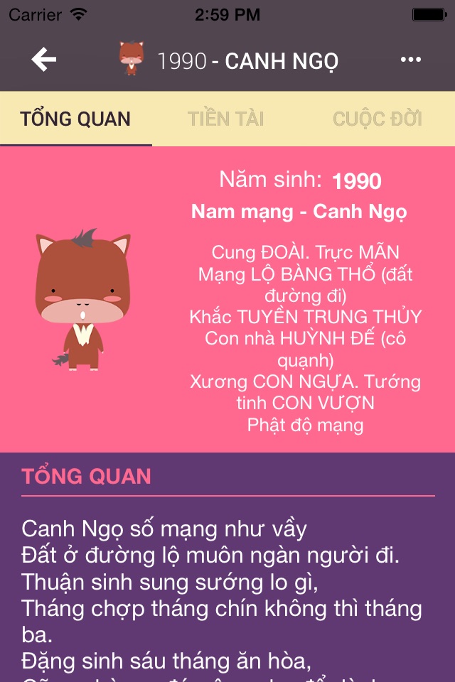 Vietnamese Horoscope application supports searching for life-horoscope including: