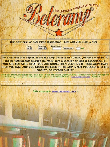 The best and worldwide famous BETERAMP TUBE BIAS CALCULATOR. This app is a 3 awards winner by the Vintage Electronics Magazine and the London University of Electronics. Get the most accurate values to set up your tube amp properly and make it safe and sounding like never before. The best thing of this app is that you can use it even when you have no INTERNET connection, wich is great as many times you cant have internet access in the same place that you are fixing or re-biasing the amp, it is so easy to use and fast. Therere lots of calculators on the net but they are not as accurate, fast like this one, also they need you to be ONLINE to work so you cant always use them. This app was developed by Paco Pascual himself, recognized by the most well known electronics Universities around the world. You will need this calculator always and now its got the best price ever, AMAZING !