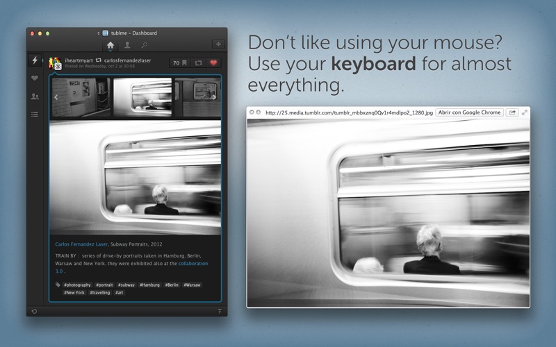 Das App sieht zwar gut aus, aber für den produktiven Einsatz eher nicht zu gebrauchen. Es stürzt auf einem macbook pro retina häufig ab. dazu kommt es vor, dass es anfängt zu ruckeln bis nur noch schleppend bilder nachlädt und ruckelt. Negativ angemerkt sei, dass die bedienelemente über dne beiträgen zu finden ist, was genau anders rum ist wie bei der original tumbler oberfläche, wo sie sich unterhalb befinden. Dies führt dazu, dass man am anfang die falschen bilder liked etc. Ich würde mir vor allem mehr Stabilität wünschen