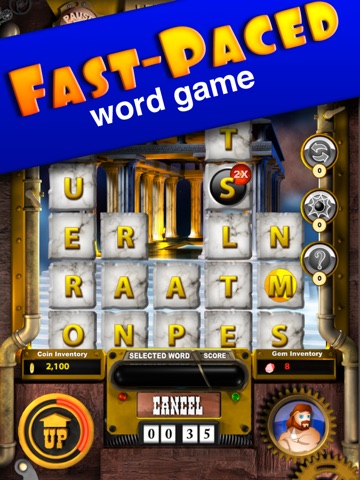 Tumbling Tiles is the latest mobile app from the Brain Glove development team. It’s a fast-paced game that combines the challenges of word games with the frantic pace of puzzle games. Tumbling Tiles hurdles players through history using a steam-powered time machine. On your journey you will enlist the help of Hercules and other historical figures (like Athena, Ramesses, Cleopatra, etc.) to help you complete levels, collect coins, and earn gems. Players spell words by tapping the lettered tiles on the game board. The tiles that are used to spell words are eliminated from play and generate points. You must act fast, though, because new tiles will be added to the game board as time progresses. The newer tiles will displace other tiles on the game board by pushing them closer and closer to the top. If they reach the top of the board, all of the tiles will tumble and the level is over. Your score for the level will determine how many gems you have earned. Earn at least one gem to complete the level and move on to other levels where the action gets faster and more challenging.