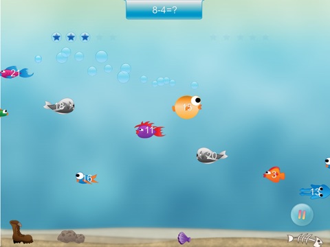 In “Math” mode, you can choose between addition/subtraction, division, and multiplication. The fish will swim past with various answers, so you will need to select the fish with the correct answer to the math problem. Answer ten questions correctly, and you’ll beat the level and earn gems!