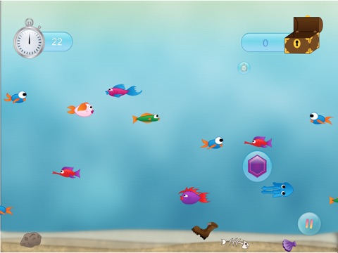 In “Treasure Hunt” mode, beat the clock to collect as many gems as possible and beat your last high score. Tap the fish to propel them into the floating gem bubbles! When you start running low on time, you can collect timer bubbles to give you more seconds on the clock. When the game’s over, you get to keep your gems so that you can get goodies to dress up your fish tank!