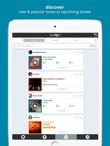 Tunefly is a mobile app and community for Artists, Fans and Venues built around local music discovery in your scene and beyond. Artists can record or upload their music to their profile and post upcoming shows. Fans can stream and review music, make Mixtape playlists and find out what shows are happening in their area. Venues can post upcoming concerts and open mics, book artists and promote them with never before experienced access to fans (coming soon). Tunefly aims to make the world of independent music accessible again by providing a platform for recognition and exposure and a way to build and interact with an engaged fanbase.