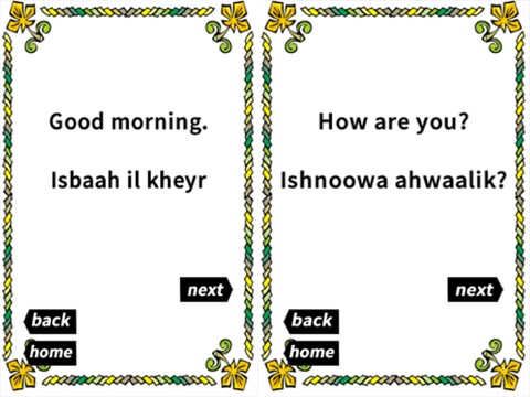 Simply touch each term or phrase to hear the term or phrase spoken in English and Tunisian. The Tunisian translation is repeated twice (the second time more slowly) to help students understand the pronunciation of each term or phrase.