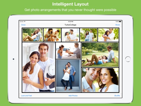 Built with a focus on ease of use, TurboCollage lets you combine photos into beautiful collages in 2 simple steps — select a size & select photos to use. With TurboCollage, you are not stuck with the same 2, 3, or 4 picture collages with fixed layouts. You can use as many pictures as you want and TurboCollage does the hard work of laying them out to an amazing collage that would surprise you and your friends for sure.