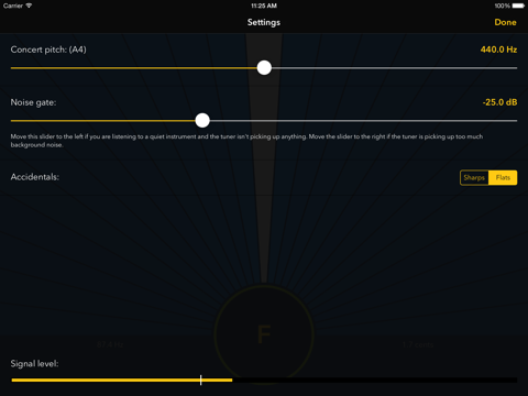 * Customizable noise gate level to prevent interference or to make the tuner very sensitive.