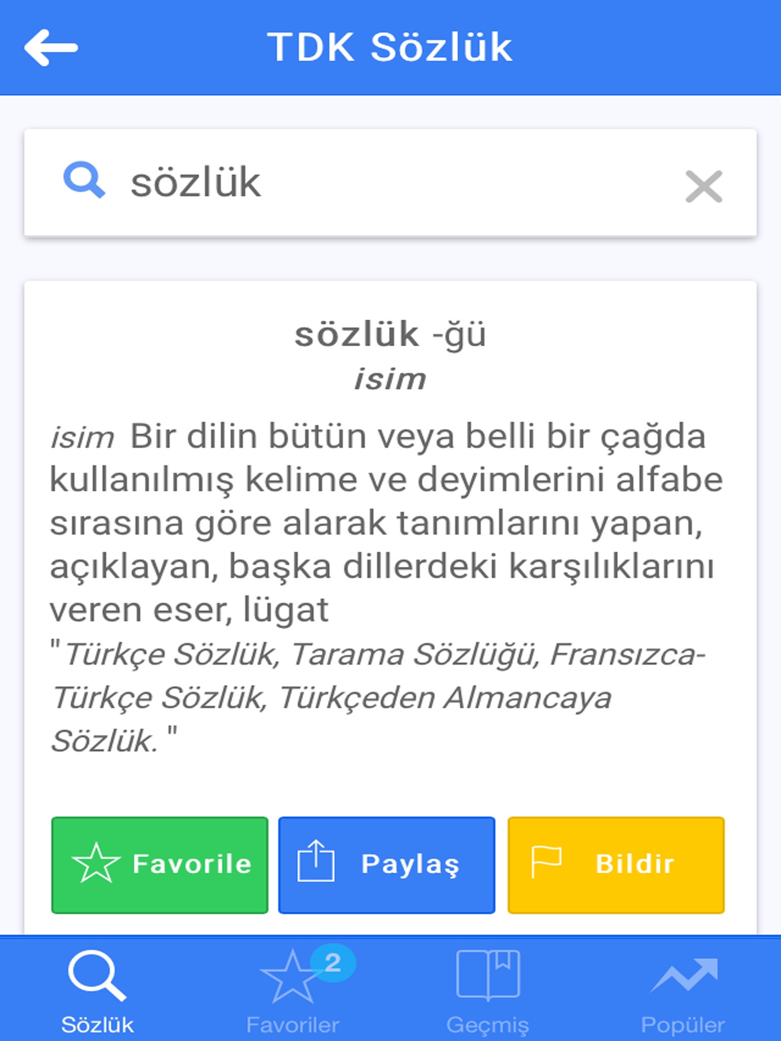 Türk Dil Kurumu tarafından onaylanmış güncel Türkçe kelimeler ile oluşturulmuş büyük Türkçe sözlük. Popüler aramaları takip edebilir, eski aramalarınızı hatırlayabilir ve sonradan tekrar incelemek üzere kelimeleri favorilerinize ekleyebilirsiniz.