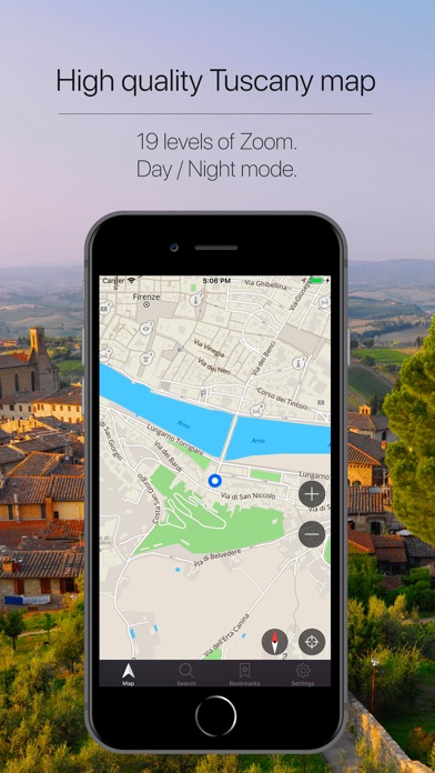 The App contains detailed maps of the biggest cities in Tuscany, Italy: Florence, Prato, Livorno, Arezzo, Pistoia, Pisa, Grosseto, Siena, Empoli, Capannori, Cascina and others.