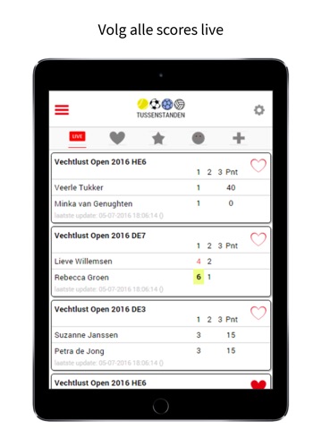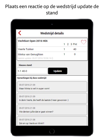 Houd standen bij voor (amateur) tennis wedstrijden en houd het thuis publiek op de hoogte. Volg wedstrijden waar je niet bij kunt zijn.