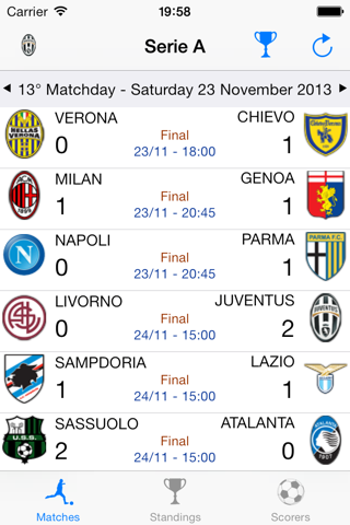 Ottima app, suggerisco lidea di aggiungere una barra per ricercare i diversi campionati, o squadre, in modo da perdere meno tempo. Segnalo alcuni stemmi da aggiornare, come per esempio nella Serie A quello dellInter, Crotone e Cagliari.