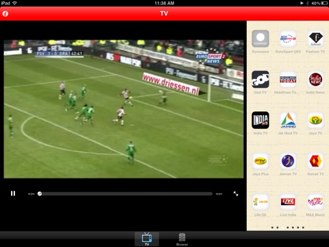 There is no livestream of the most tv channels in the list. Dont invest your money for this app. Hopefully some of the channels will be accessible in future. Half of the channels are nevertheless of low quality or not for hindi speaking listeners. Those channels with lifestreaming also show a bad Picture .