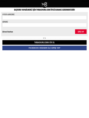 TV8 programlarına başvurmak artık çok kolay! Uygulamayı telefonuna hemen indir! Üye ol ya da Facebook profilin ile giriş yap. Telefonunla başvuru nedenini ve yeteneğini en iyi anlatan videonu çek ve bize yolla! Hayallerini kurduğun programa katılma şansını yakala!