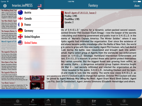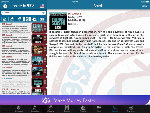 tvSeries.imPRESS deals with tv series. tvSeries.imPRESS finds them for you and makes them available,organized in different categories, on your device. Download from iTunes your favorite tv series!