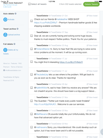 – Even better, use our Auto Delete feature if you want to continuously keep your Twitter account in order. Auto Delete will continually monitor your account and delete the oldest tweets based on your defined criteria - based on the tweet date or the number of tweets you want to keep. Activate Auto Delete if you don’t want to worry about old tweets taking up space in your Twitter feed.