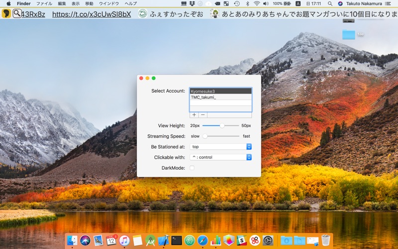 · You can switch accounts and search keywords at Preference. In addition, it is possible to change the view height, stream speed and view position.