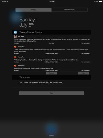 Browse the twenty-five latest posts from your Chatter feed directly from your lock screen or within any app using the TwentyFive Notification Center Today View Extension for Chatter.