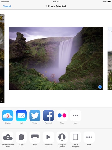 Save Files and Photos easily to Chatter Files for later sharing or collaborating using the TwentyFive Action Extension for Chatter without leaving your active App.