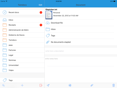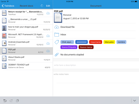 Upload notes, photos and documents. You can use Twindocs to organize, classify, tag in color and staple.