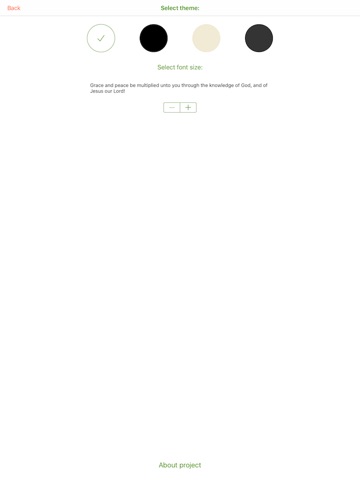 In application, you can save notes and mark verses with color markers. Search text in Bible and notes. You can find all verses marked one color. Optionally, you can save your data in iCloud.