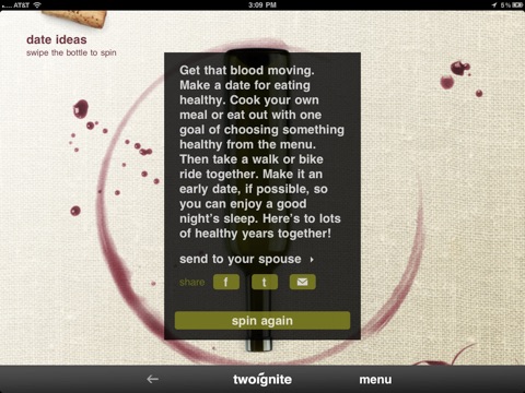 Spin the Bottle : just like high school prom... without the sappy hair band music. Spin the bottle and get fun tips and activities to reignite your passion for your spouse and engage in conversations with others.