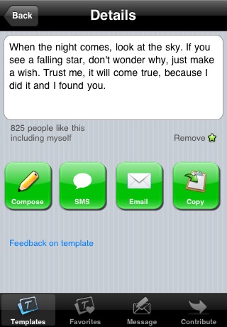 Compose SMS with 3000+ templates such as: miss-you, good nights, jokes, pickup lines, wise words, valentine messages, etc..