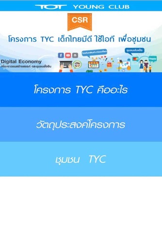 โครงการ TOT Young Club (TYC) เป็นโครงการหนึ่งที่สำคัญของ CSR ของ บมจ. ทีโอที และเป็นส่วนหนึ่งที่สำคัญที่จะตอบสนองนโยบาย Digital Economy โดยการให้ความรู้ความเข้าใจเรื่องการใช้ไอซีทีอย่างถูกต้องสำหรับเด็กและเยาวชน ทั้งการถ่ายภาพ, การตัดต่อวิดีโอ รวมถึงการทำสื่อออนไลน์ผ่าน Facebook, YouTube, เว็บไซต์, การตลาดออนไลน์ รวมถึงการสร้างความยั่งยืนให้ชุมชน ด้วยการสร้างรายได้ โดยการขายสินค้าออนไลน์ผ่านทาง Facebook Page