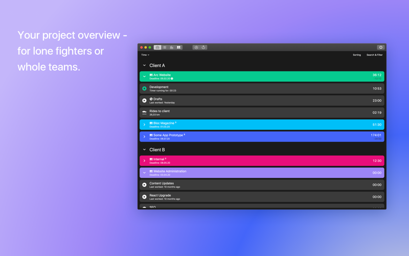 The interface is designed to provide an overview of your recorded times, projects, budgets and deadlines at any time. Unbooked times are automatically displayed. Running timers are always visible and can be started or stopped via shortcuts without opening Tyme. So you can work without being disturbed by time tracking.