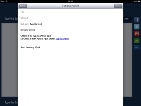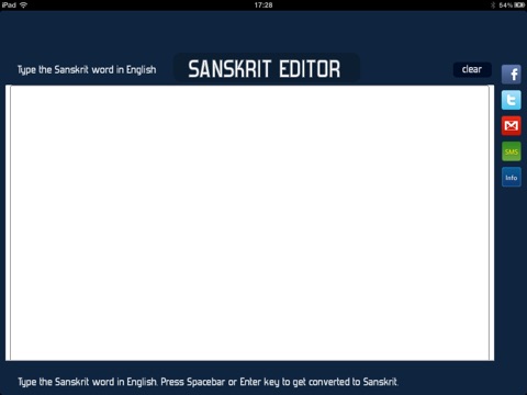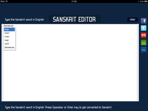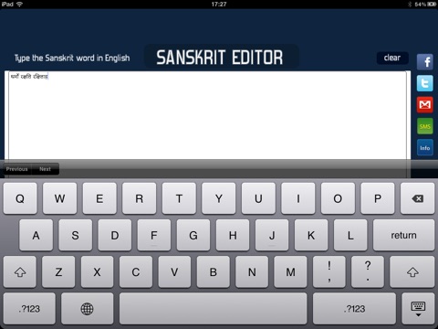 With TypeSanskrit universal application which runs on both iPhone/iPod Touch and iPad, you can WRITE in SANSKRIT and share it to the world via Facebook,Twitter,SMS and mail with a click of a button!!!