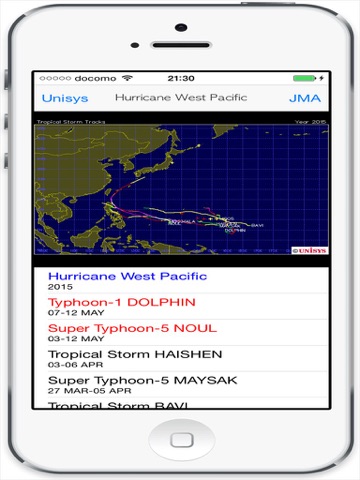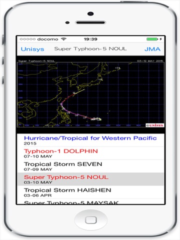 今年発生の台風全部表示されます。現在発生中の台風はリストに赤い文字で表示されます。