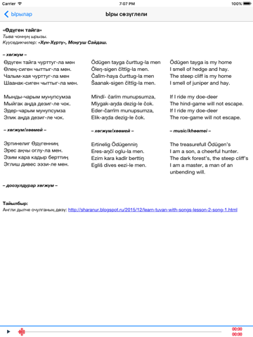 Collection of Tyvan traditional songs with player. The list of songs is updatable. Each author can add own lyrics of the song in Tyvan into the application, contacting with the author of the application.
