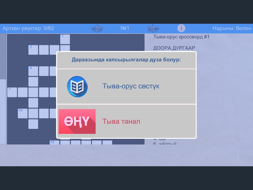 Tyvan words - the application of a crossword puzzle with Tyvan words. There are simple and complex crosswords. Now there are 3 types of crosswords: classic crossword, crossword translation from Russian into Tyvan and crosswords of Tyvan riddles.