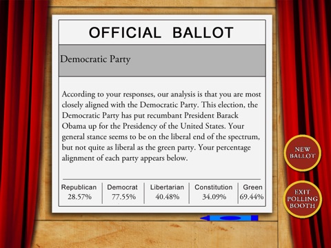 Which way do you lean politically? Which U.S. Presidential candidate is most closely aligned with you? If you want to avoid the speeches, the rhetoric, and the double talk, but still want to vote, check this app out. Answer these simple, but targeted questions about political issues and we will tell you which party you are most in line with. You may be surprised.