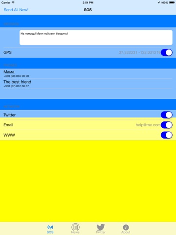 Main goal of this program - to enable to quickly send an SOS signal to multiple phone numbers, e-mai, send to Twitter, Facebook and VKontakte.