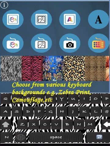 Get creative with your ios 8 device keyboard by using these colorful, eye-catching, conversation starting, keyboard templates, button design templates, and font colors delivered in this app. Additionally you can select to use your own photo as the keyboard background. You also have the option of selecting your own font style, font color, button color and keyboard background color. This app comes with a color picker each for your fonts, buttons and keyboard background. Truly Amazing!