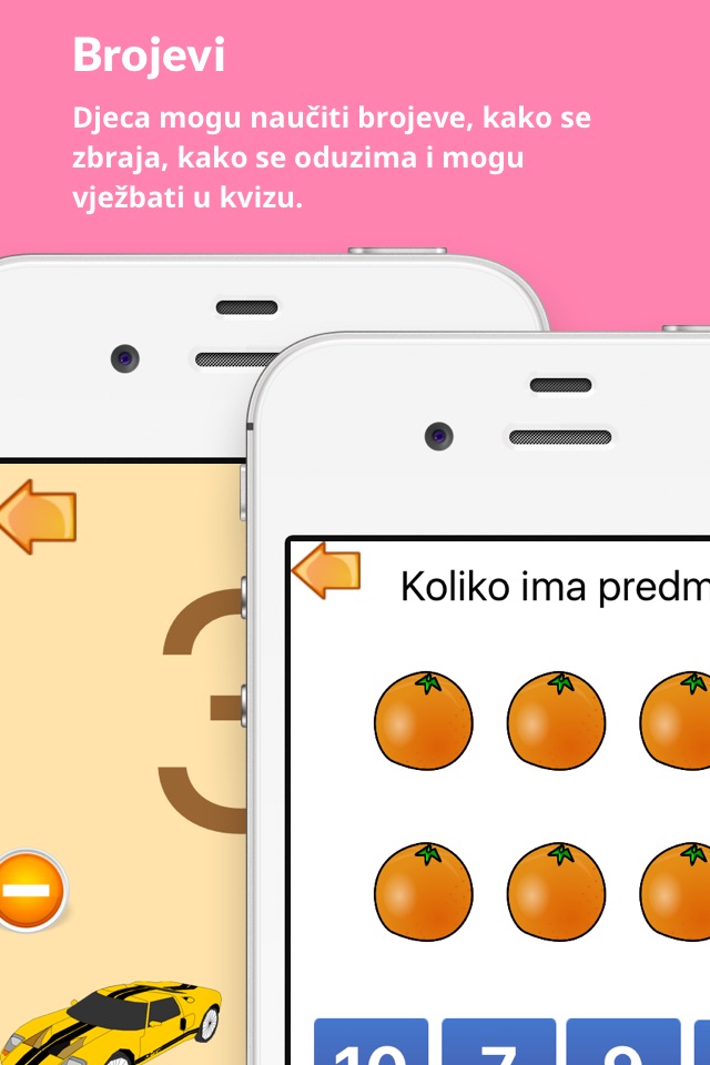 Kod Brojeva se mogu naučiti brojevi od 1 do 20 te potoje tri kviza preko kojih dijete može naučiti osnove brojanja, zbrajanja i oduzimanja.