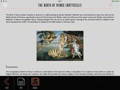 - Selection of Paintings: Santa Trinita Maesta, Rucellai Madonna, The Battle of San Romano, Coronation of the Virgin, Madonna and Child, Primavera, The Birth of Venus, among others.