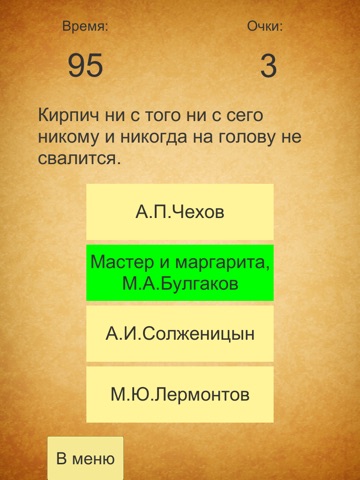 Цитаты от более чем 50 классиков российской и советской литературы. Настраиваемая сложность игры для любого уровня подготовки!