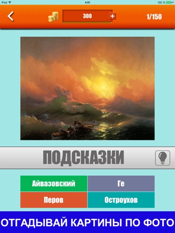 Викторина для знатоков живописи. Ваша задача - угадать художника по фотогорафии картины, выбрав один из четырех вариантов ответа.