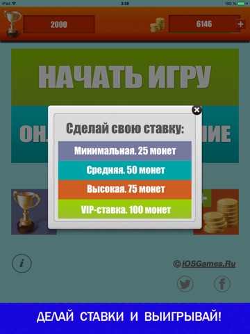 Играть можно как в одиночку, так и через Game Center. При онлайн-состязании вам сначала нужно сделать ставку (от 25 до 100 монет) и подождать пока программа найдет вам соперника. Все поединки очень скоротечны, состоят из пяти раундов и длятся не дольше 1 минуты. Выигрывает тот, кто ответил на большее количество вопросов, а если оба игрока дали одинаковое количество правильных ответов, победитель определяется по времени. Если и этот показатель равный, то присуждается ничья. В этом случае сделанные ставки зачисляются на счет обоим игрокам.