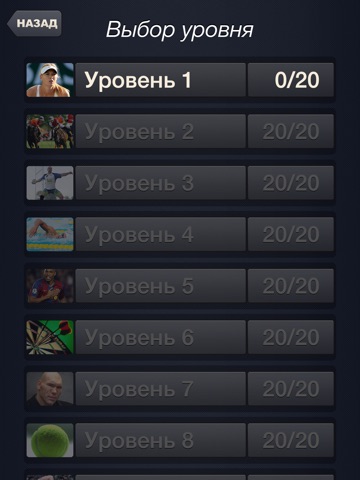 - 180 увлекательных уровней (звезды спорта, название команд и клубов, виды спорта, название снарядов, фамилии тренеров и многое другое из мира спорта)