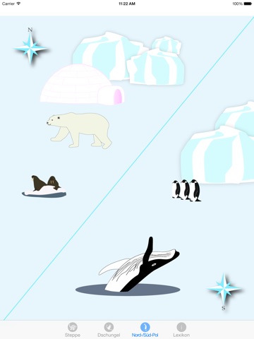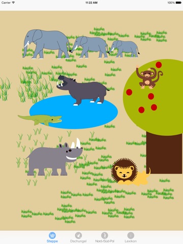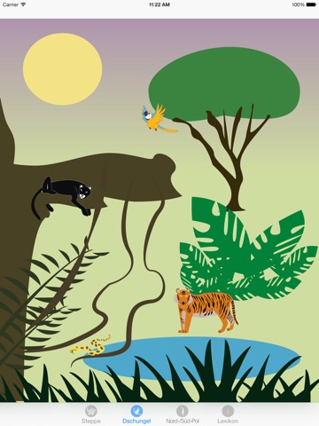 Je nach gewähltem Lebensraum (Steppe, Dschungel, Nord/Süd-Pol) erscheint eine Auswahl von Tieren, welche durch antippen ihre Laute von sich geben.