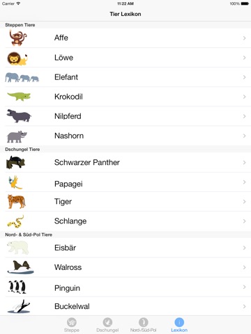 Im Lexikon sind pro Tier vier Fotos zu sehen und man kann zu jedem Tier die wichtigsten Daten (Grösse, Gewicht, Alter) sowie ihren Lebensraum und ihre bevorzugte Nahrung nachlesen.