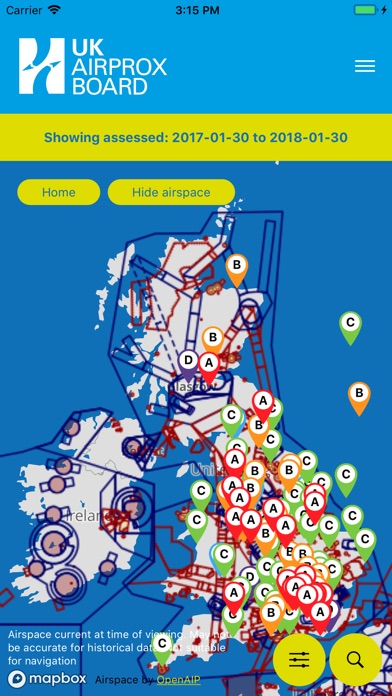 Users can also use the App to view previous incidents via a map interface, which they can filter by date, severity and other factors. Associated reports can be downloaded and viewed as pdfs by touching individual displayed map icons. Alternatively, individual Airprox reports can be searched for and downloaded by Airprox number.